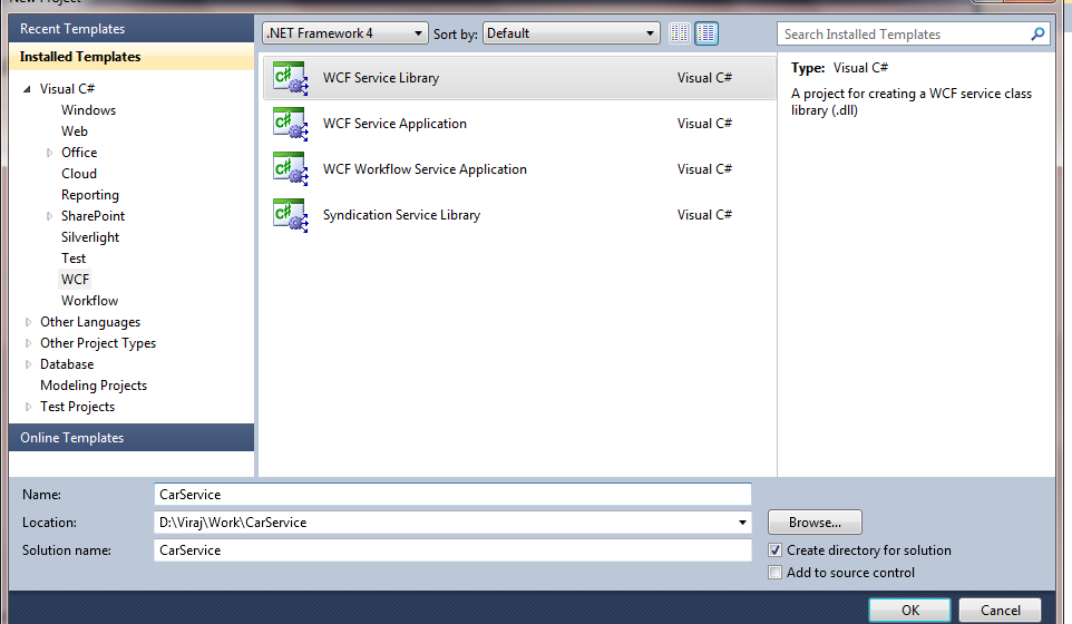 Select WCF Service Library and provide the name of the service as CarService. You can use whatever name for the service as you wish.