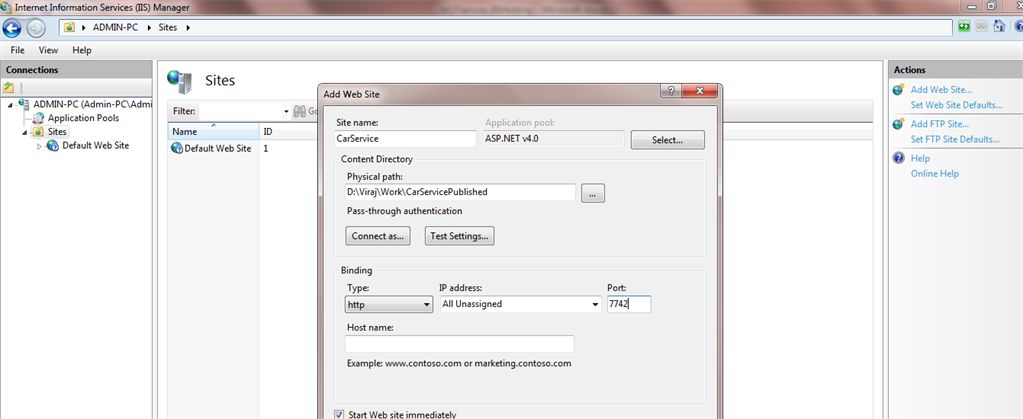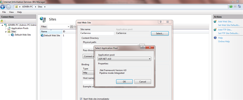 Give the name of the service as CarService and select Application Pool as ASP.NET v4.0 as in the following: