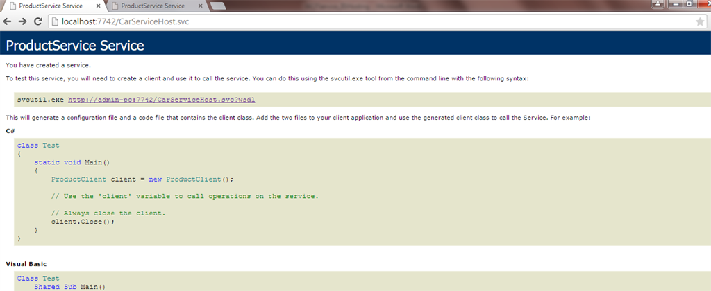 Now just open the browser and for the URL provide "http://localhost:7742/CarServiceHost.svc" or "http://ipaddress:7742/CarServiceHost.svc".The following page will open: