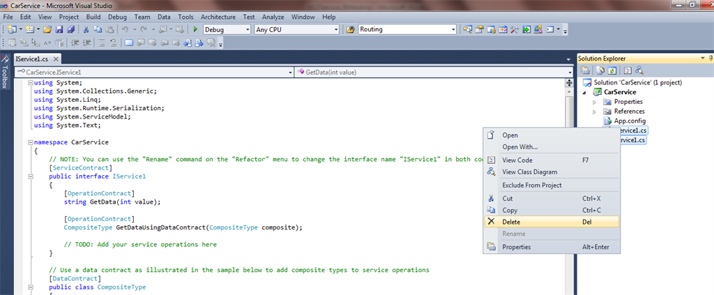 Delete the Iservice1.cs and Service1.cs files from the project.