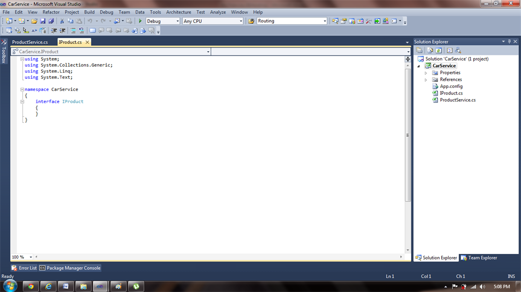 In the ProductService.cs file call the Interface file and write the definition of the Interface methods.