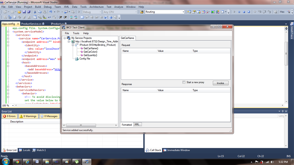As you can see we are using wsHttpBinding. The Service name is <service name="CarService.ProductService"> Contract is contract="CarService.IProduct">,