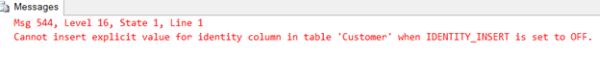 SQL Server has thrown the preceding error when I attempt to insert a value into the ID column. For example, let's say a customer was deleted by mistake and you want to retain their original CustomerID. What would you do? If you inserted the record like we have in the examples above then the next highest number will be inserted, not the original value. Let's check out the example below to show how to solve this issue.