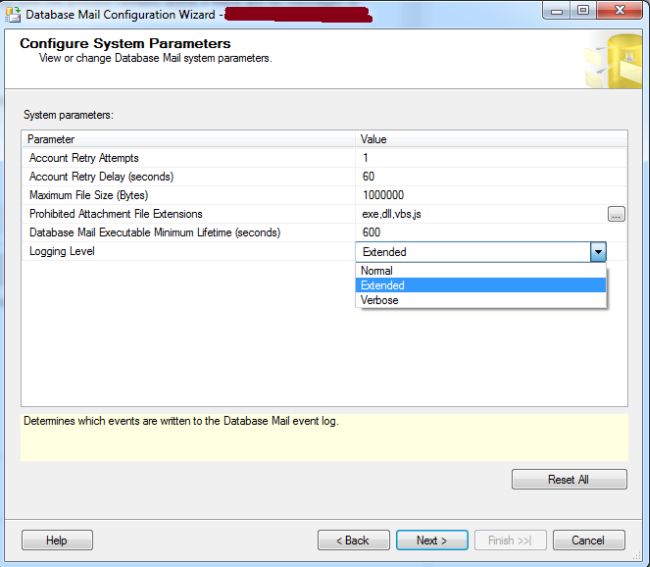 - Logging level: which messages are recorded in the Database Mail log. Possible values are: