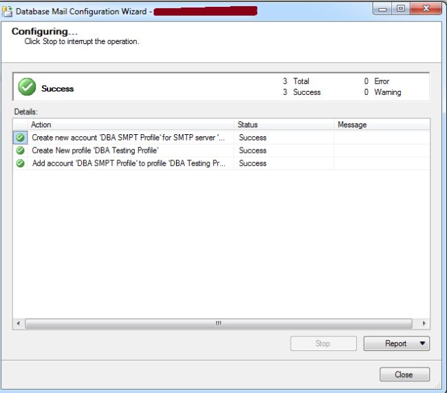 Now all actions has been completed successfully. Click Close to exit the Database Mail Configuration Wizard.