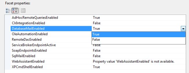 Now find DatabaseMailEnabled in the Facet properties section and change its value from False to True and then click the Ok button.