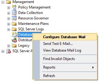 Database Mail Configuration WizardNow select Database Mail Configuration Wizard, in Object Explorer, expand the Management folder in SQL Server Management Studio, right-click Database Mail, and select Configure Database Mail.