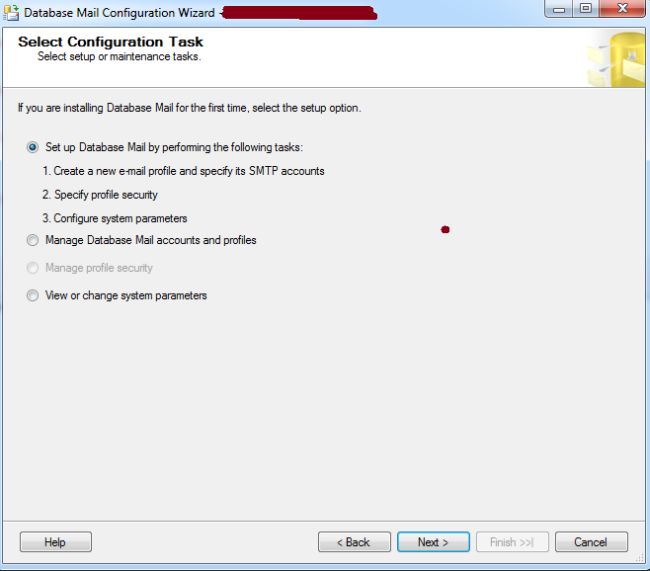 Now the Select Configuration Task screen chose Set up Database Mail by performing the following tasks: Click Next to continue.