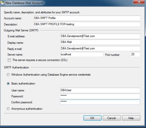 , @description = 'DBA SMTP account for Testing'