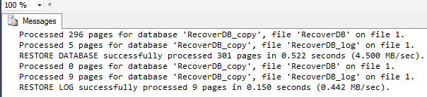 Now I will restore a copy of the RecoverDB database and restore a Log backup with the STOPBEFOREMARK option to recover the exact LSN.