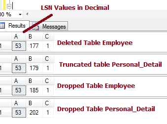 You can see in the screen above that I have recovered the deleted data from the Employee table using the Transaction Log and LSNs.