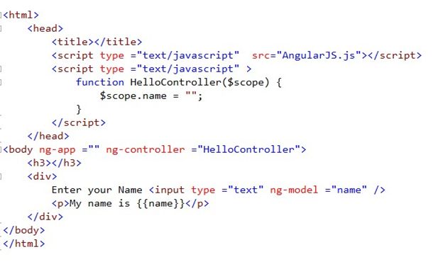 ng-controller: AngularJS application are controlled by ng-controller which is a JavaScript object. Here we use ng-controller=”HelloController”, and we created a model on behalf of this controller.