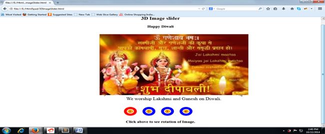 The following image is the result. When we click on the circles we can see the 3D Image Slider Effect or we can use SetInterval() in JavaScript to see the continuously moving image slider. For tips you can refer to my previous blog: