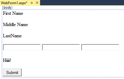 In this I have taken three labels that indicate the first name, middle name, last name and I have also taken three textboxes for input from the user. Also, I will add a button for performing the operations.