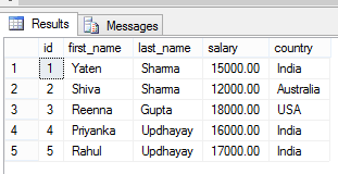 - 1, 'Yaten', 'Sharma', 15000, 'India'