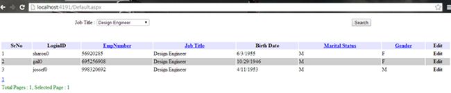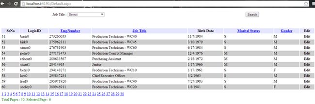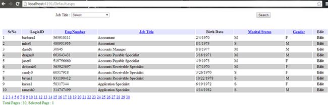 The preceding Stored Procedure will always return <= 10 records with RowNumber manipulated depending on sortBy and Filter expression. Also the OutPut parameter @totalRows returns TotalRows for calculating the pages requred to display the data for the selected sortBy and Filter criteria.