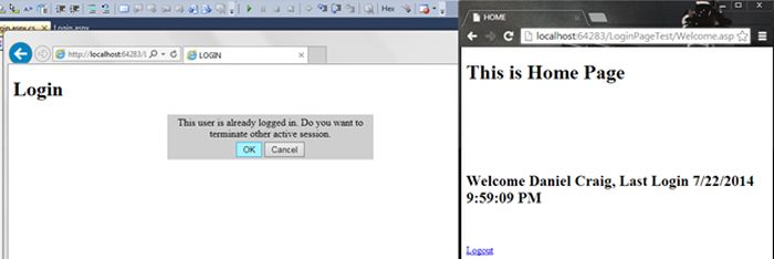 Also on the home.aspx page it is required to check that the sessionID stored in the database and the sessionID received from the current user are the same. This ensures that only one session is active per user.
