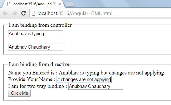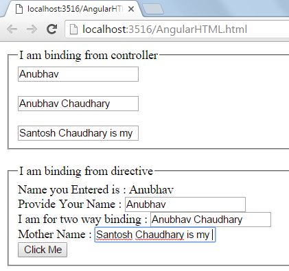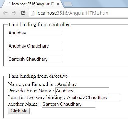 - "Provide Your Name : <input type='text' ng-model='text' /> <br /> I am for two way binding : <input type='text' ng-model='doublebind' /> <br /> Mother Name : <input type='text' ng-model='parentname' /> <br /> <input type='button' ng-click='call()' value='Click Me' />"