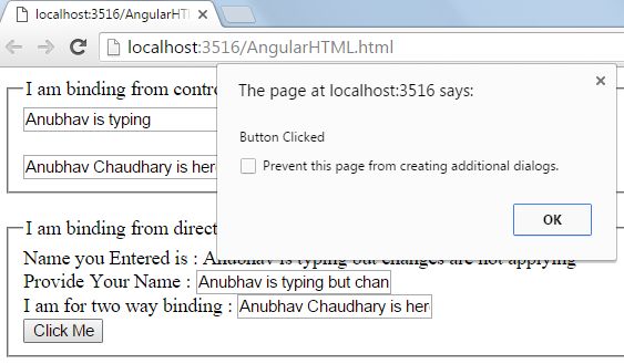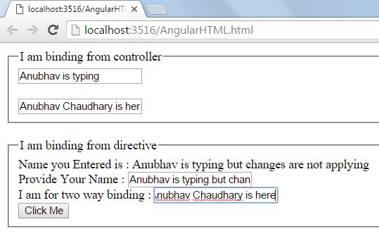 - "Provide Your Name : <input type='text' ng-model='text' /> <br /> I am for two way binding : <input type='text' ng-model='doublebind' /> <br /> <input type='button' ng-click='call()' value='Click Me' />"