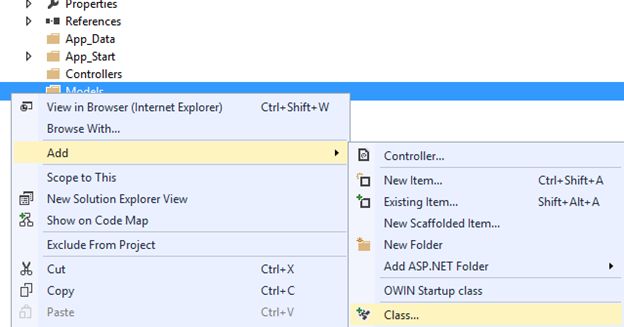 4. Adding a model: A model can be any class that represents the data in your application. The ASP.NET Web API can automatically serialize your model to JSON, XML, or some other format and then write the serialized data into the body of the HTTP response message. So I am creating a Customer Model over here.