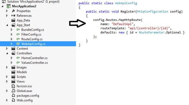 There is 1 more routing config that has been added to the App_Start folder, WebApiConfig.cs along with RouteConfig.cs. This Config file contains a similar Routing table that we usually see in MVC routing. But the only difference we find over here is the routingTemplate starts with api/{controller}/{id} and there is not an action specified. As I said before the WEBAPI mainly works on HTTP verbs which means if I have any action that starts with GET (for example: GetCustomer), it will consider it as a WEBAPI method. The same for the other methods also.