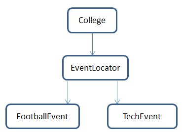 The code snippet above shows an EventLocator class between the Events and College that helps us locate the service without knowing the concrete type. Hence any changes to EventLocator will not affect the College class. I am just passing the index value in the constructor that, in turn, calls the third party to locate the event and return it to the constructor.