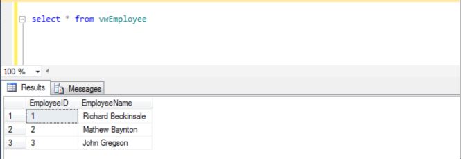 - insert into vwEmployee values(1,' Helen Mirren'),(2,'Ricci Harnett'),(3,'Dani Harmer')
