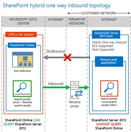 An inbound authentication topology lets SharePoint Online make authenticated connections to the on-premises SharePoint Server 2013 farm as shown below.