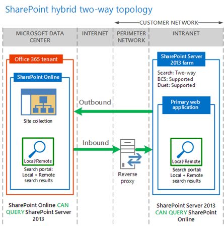 A two-way authentication topology lets SharePoint Online make authenticated connections to the on-premises SharePoint Server 2013 farm and lets the on-premises SharePoint Server 2013 farm make authenticated connections to SharePoint Online as shown below.