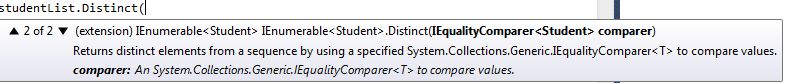That's normal, but let's suppose we have a scenario where we want to have all student objects with a distinct country and city from the list. We can see in the editor itsef that we have 2 extensions to this distinct extension method and they are as follows: