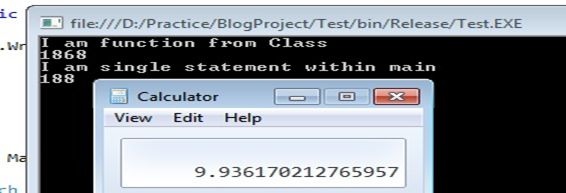 Here I want to print a single message in the output window and at first I have implemented it within a static function and call it by class name and the second time I have just written it within the main function. Yes very simply by Console.Writeline(). And the output screen is saying that the single line execution is 9 times faster than the function. And obviously we will not start the debate of the topic "Advantages and disadvantages of functions" ( Ha Ha..).