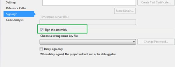 In the properties window, you will find the “Signing” tab. Here, we can sign our assembly to provide a strong name.