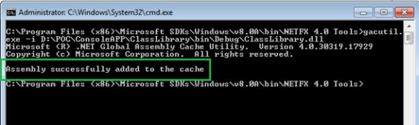 Fine, the assembly is ready for use. Now open a command prompt in “Administrator” mode and run gacutil.exe.