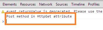We are seeing that we are making a GET request to the ajax() function. Here is the implementation of the Web API and we are seeing that the HttpGet attribute is specified on top of the Post() action.