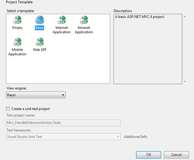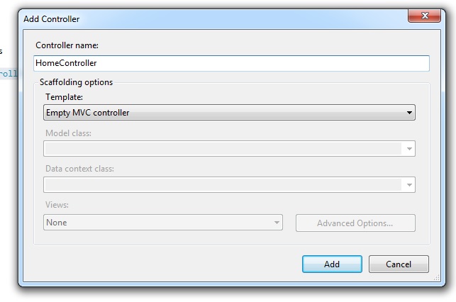 To avoid that we need to create another controller that overrides HandleUnknownAction. Right-click on the "Controller" folder in Solution Explorer yhen select Add then click on Controller. Name it "MyBaseController". Inside that class remove the index action method and add the following method.