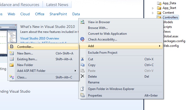 Add a controller to our application. Right-click on the Controllers folder in the Solution Explorer then select "Add" -> "Controller...".