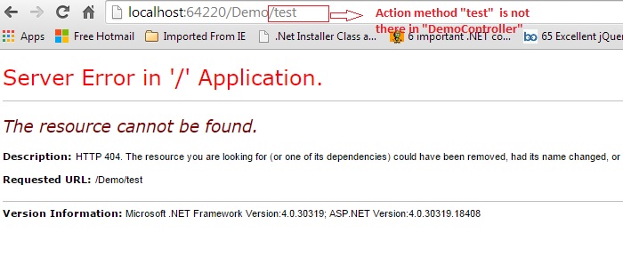 The preceding URLs work fine because the Home and Demo controllers have an "Index" method. But it will get the following error if we give something else instead of "Index" in the URL because both are a controller.