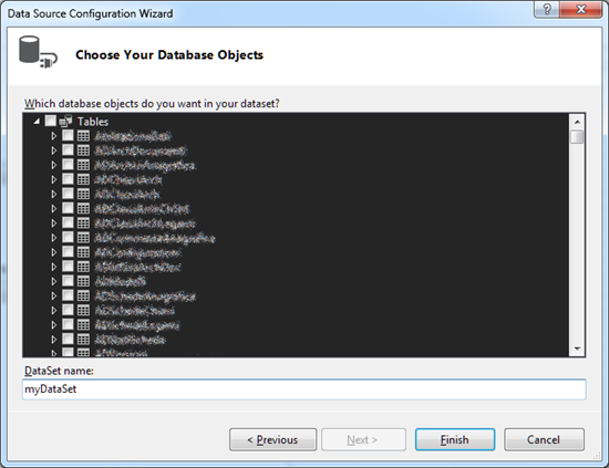 After selecting a connection type and the objects to use, the wizard proceeds in creating a DataSet with a XSD file that represents its schema. It could now show us the fields presents in our, say, table.