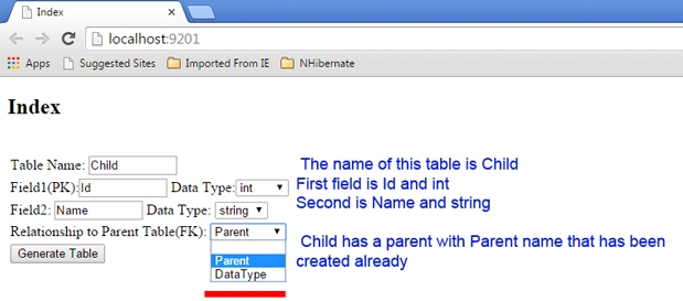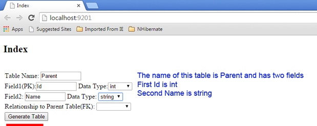 You determine your table spesification on the UI and then Angular sends info to the controller and there by using "GenerateTable.cs" and "GenerateMap.cs" with a GenerateDBController/Generate Action all the classes will be created on the "Entities" and "Mapping" folders. These classes, such as "Parent.cs" and "ParentMap.cs" by the FluentNHibernate utilities "NHibernate.cs" will create tables inside the database.