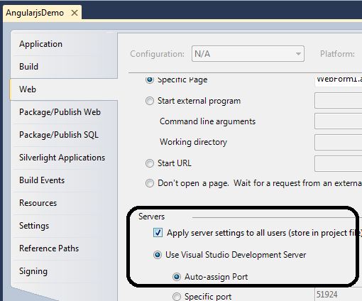 4. After setting the settings as in point 3. if we run the application using F5 then the ASP.NET Development Server would launch.
