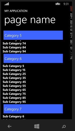 So we have used the Categories Property to contain a List<SubCategoryGroup> that we directly bind to our LongListSelector.