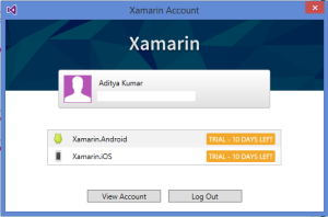 Once you log in, you can choose if you want to begin a trial or purchase a license. If you begin a trial and activate Xamarin, you can see how many days of the trial you have left at any point: