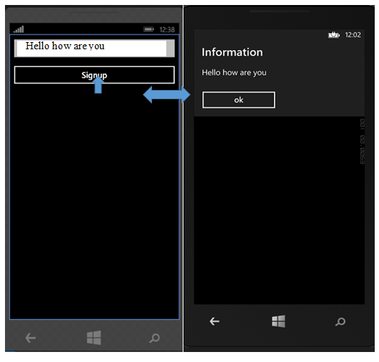 In the mainpage.xaml I have put a stack panel and in the stack panel I have used two controls, a TextBox control and a Button control. Here when I enter any text into the text box and click the button it will navigate to page1.xaml and show the entered text in the Page1.xaml as a message dialog.
