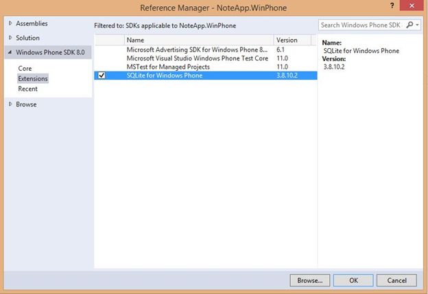 There is one more important task to do before coding, that is to add a SQLite reference for Windows Phone 8.0. For that right-click on References in the Windows Phone project and select "Add references".
