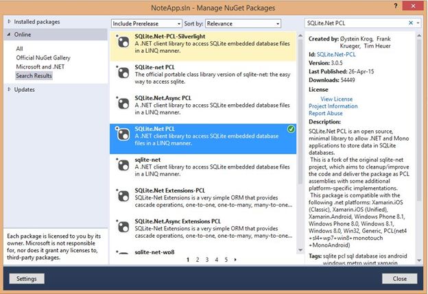 Before beginning to use it we must add the "SQLite.Net-PCL" NuGet package to the solution.