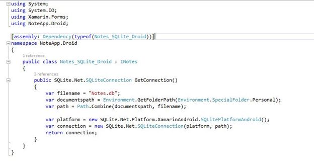 Here we want to use dependency services to define the path or location for our database to be saved and for the SQLite connection. For that I have created an interface "INotes.cs".