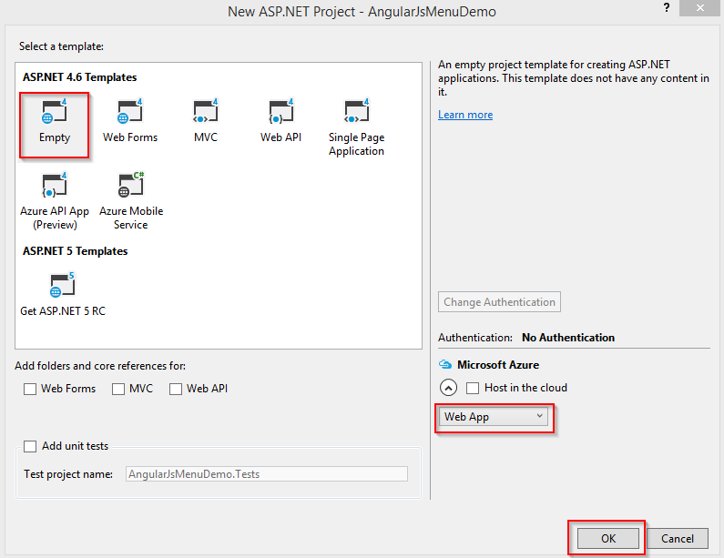 Open Visual Studio 2015 and go to file menu and point the new and then click new project. New ASP.NET project window will open, you can select a Empty Template with No Authentication and then click OK button.