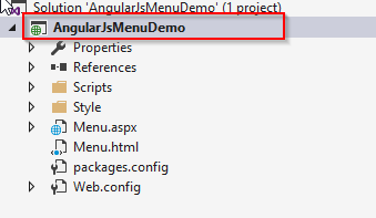 You can see AngularJsMenuDemo project structure in the following screenshot.
