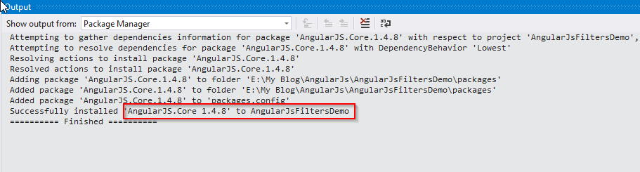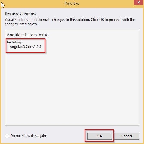 Preview window will open and you can see the AngularJS version installing details. Click OK button and after it is successfully installed in AngularJS, you can see the following,
