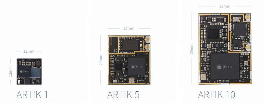 ARTIK is a family of modules (ARTIK 1, ARTIK 5, ARTIK 10) tailored for the Internet of Things (IoT). With a tiered architecture built for performance, optimized power consumption and memory utilization and footprint, ARTIK is designed specifically for a variety of applications, from low-end wearables to powerful hubs with local processing and analytics. ARTIK's best-in-class security solution includes a secure element (SE) and machine learning for anomaly detection and Trusted Execution Environment (TEE).